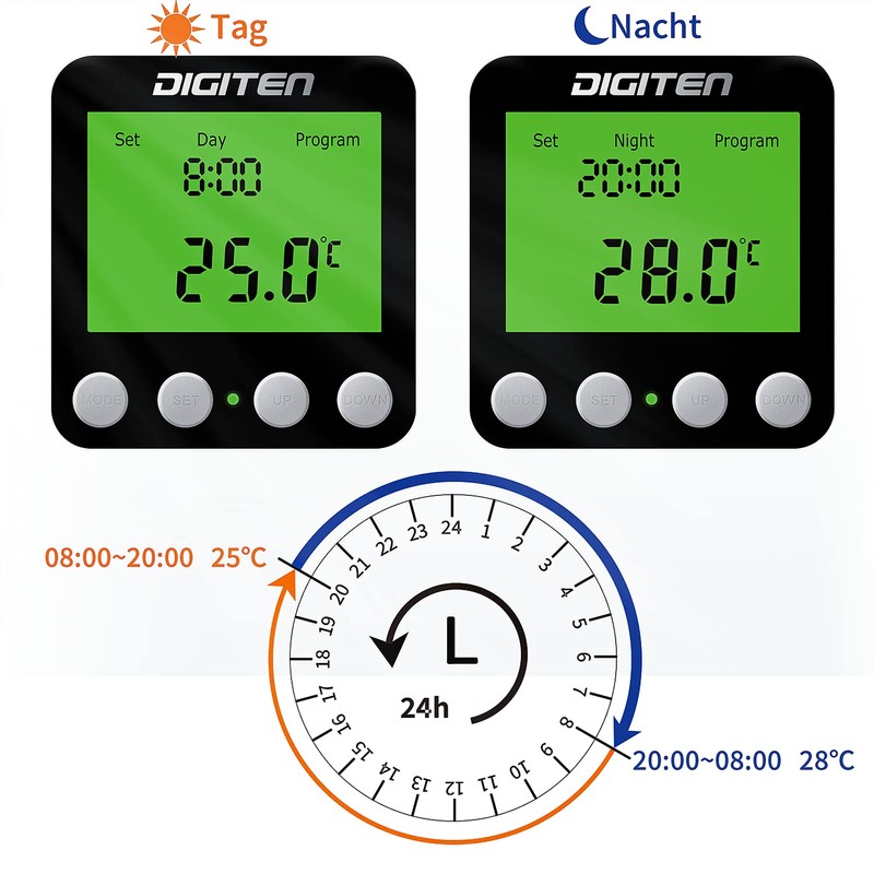 Digital Day-Night Thermostat, ℃/℉ Temperature Control, Heating/Cooling, Clock...