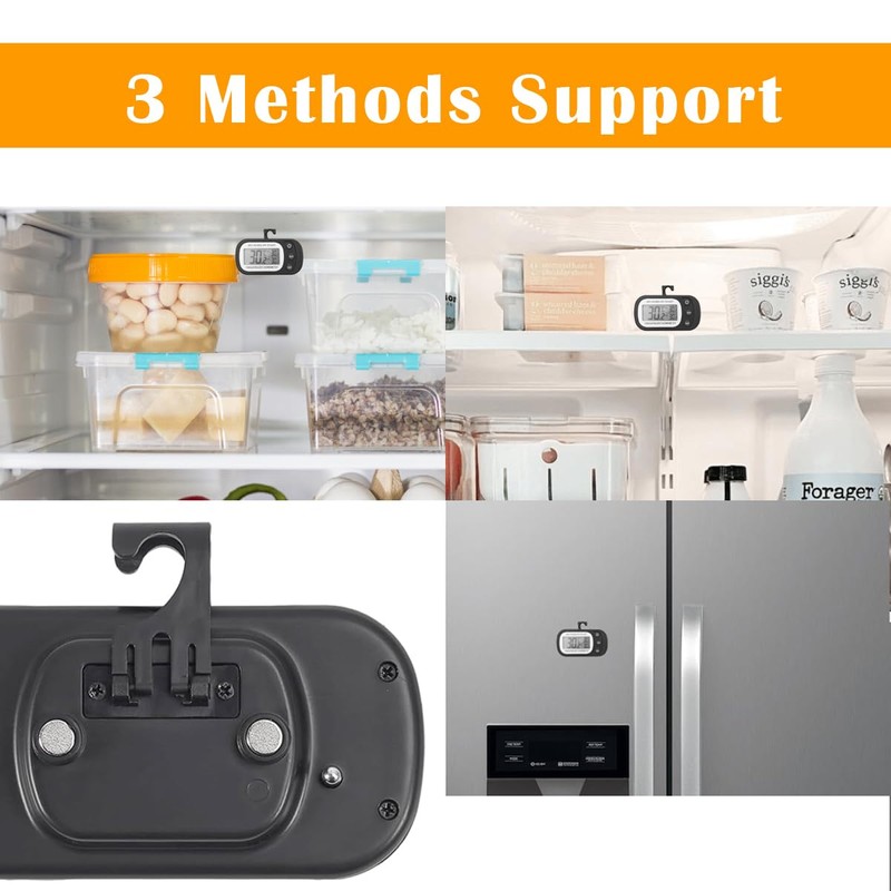 - [FLEXIBLE PLACEMENT] Thermometer can be attached to the back of the refrigerator or freezer, can be placed hanging with the bracket, or can be placed on the desktop