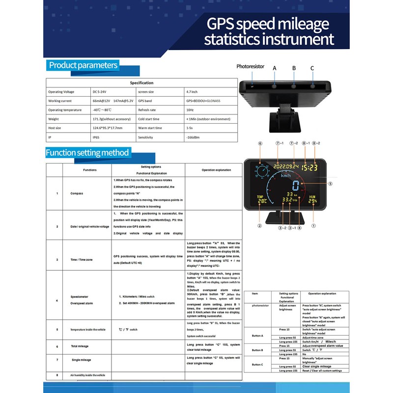 1、HD display,Automatic dimming,Default automatic dimmiOr press the key to adjust the screen brightness. 2、Alarm function, safe driving, overspeed alarm function. 3、Compatible with multiple vehicles USB (5-24V) can be used.