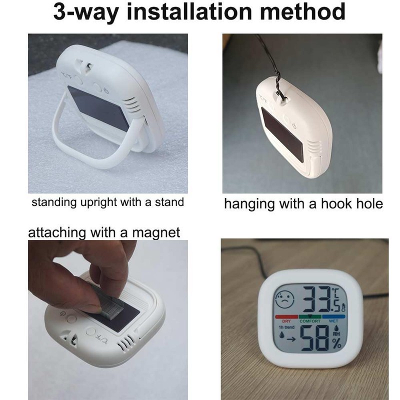 - [Multiple Mounting Options]: The room thermometer has 3 mounting options - Hanging Hole / Tabletop Stand / Magnet Attaching to be conveniently placed anywhere, such as baby room, kitchen, bedroom, greenhouse, reptiles terrarium, humidor, cellar, and incubator or other areas.