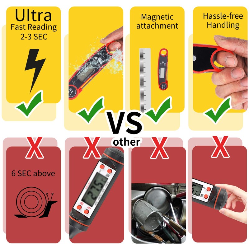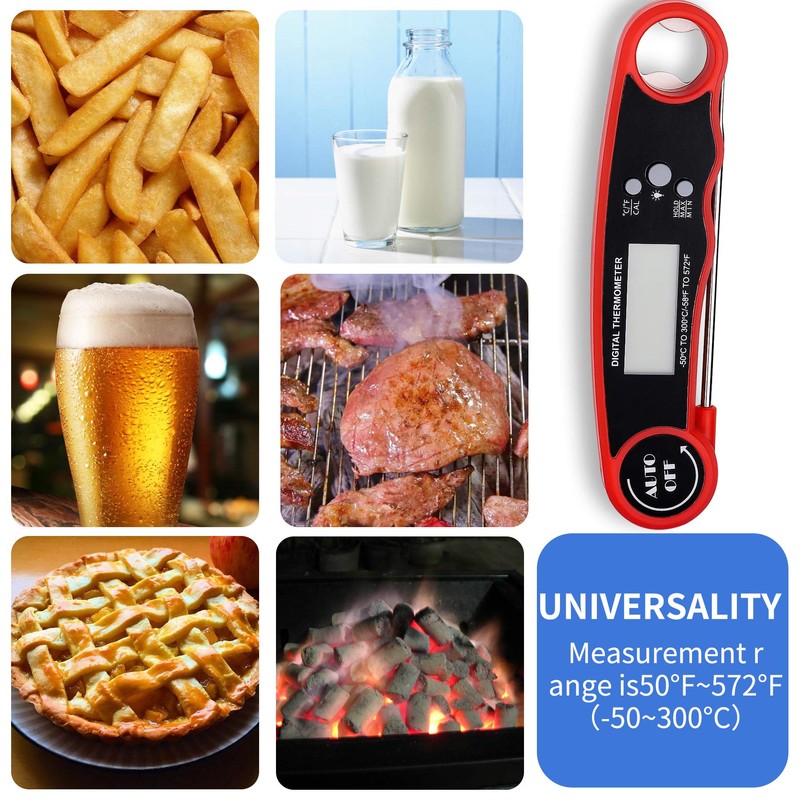 - 🔥Highly accurate - Takes the temperature accurate to +/-1 degrees with a wide range of -58℉-572℉(-50°C~300°C). No more waiting over a hot stove or grill for the temperature to settle! Take out the guesswork and eliminate overdone or undercooked food, and instead make perfectly cooked beef, chicken, pork, fish, lamb, or turkey, every time! Also works great with beverages, deep frying, making candy, and baking.