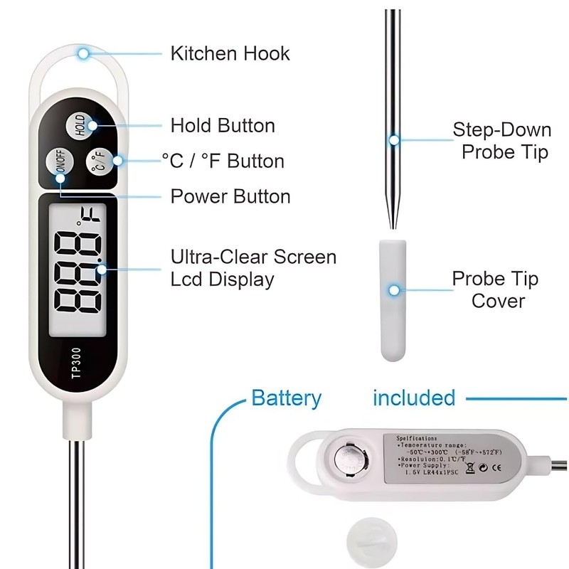 - ๐ช๐ถ๐ฑ๐ฒ ๐ง๐ฒ๐บ๐ฝ๐ฒ๐ฟ๐ฎ๐๐๐ฟ๐ฒ ๐ฅ๐ฎ๐ป๐ด๐ฒ: This food thermometer covers a broad range from 50ยฐC to 300ยฐC, suitable for various types of meat, poultry, and even baked goods.