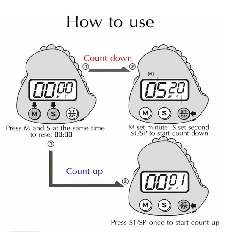 Purpose: Not only for countdown, but also can be used as a positive timer. Count down from 1 second to 99 minutes 59 seconds or use it as a stopwatch from 1 second positive to 99 minutes 59 seconds, making it the ideal timer for housewives, children, teachers and students. When the time is up, it will ring for about 30 seconds