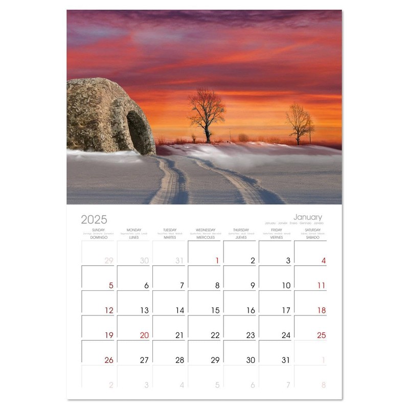 - DESIGN - 12 unique pictures, large monthly grid for planning with dates in 5 languages, including Spanish and French. 14 Month Calendar (Jan 2025 - Feb 2026).