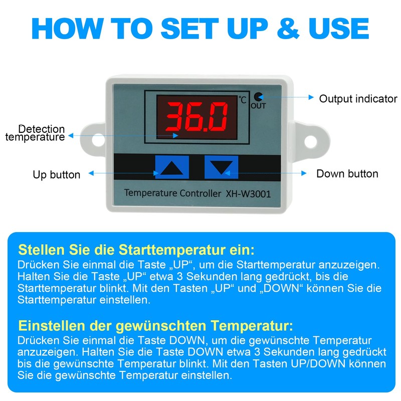 • Material The XH-W3001 digital thermostat is made of high quality ABS, flame retardant for high temperature, not easy to change color, high mechanical strength and long service life.