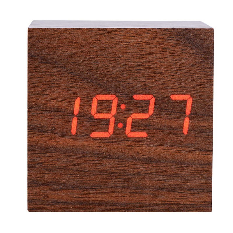 Digital LED Wooden Alarm Clock, Modern Alarm Clock in LED Wooden Cube Design with Temperature, Time and Date Display, 12/24 Hour Format, Alarm Clock, Voice Control for (Brown Wood + Red Light)