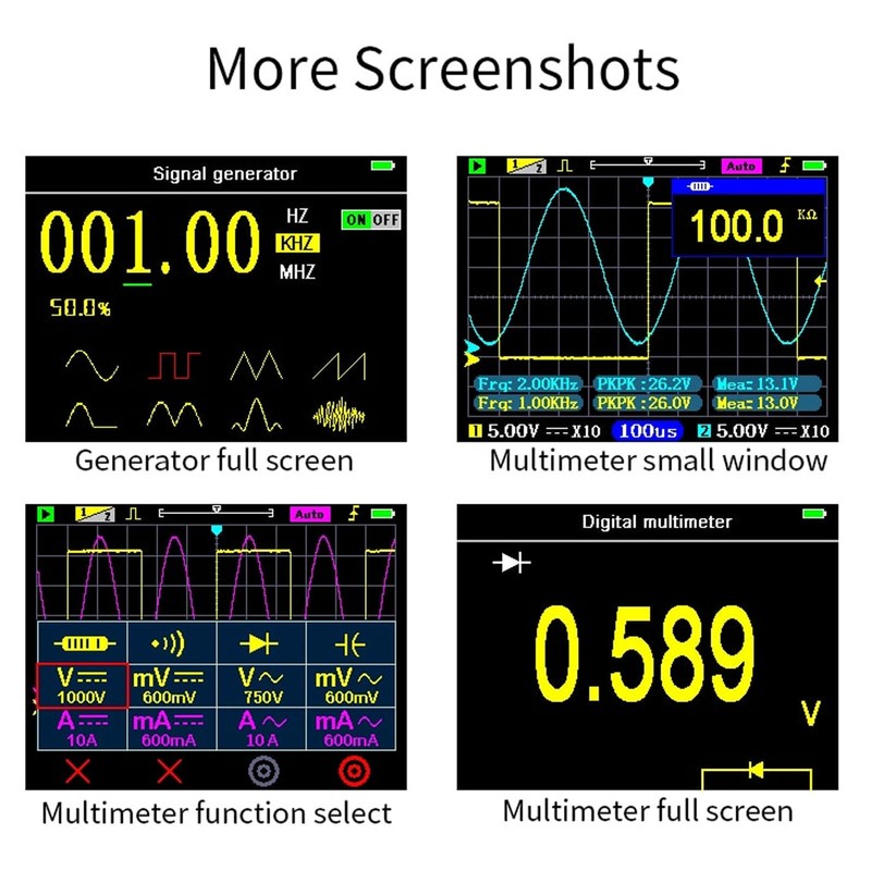 - 3 in 1 design with IPS screen: This product integrates digital oscilloscope, multimeter and generator in one device. 3.2 inch clear IPS screen, highly sensitive full view display, channel 2 waveform can be adjusted to green, cyan, purple.