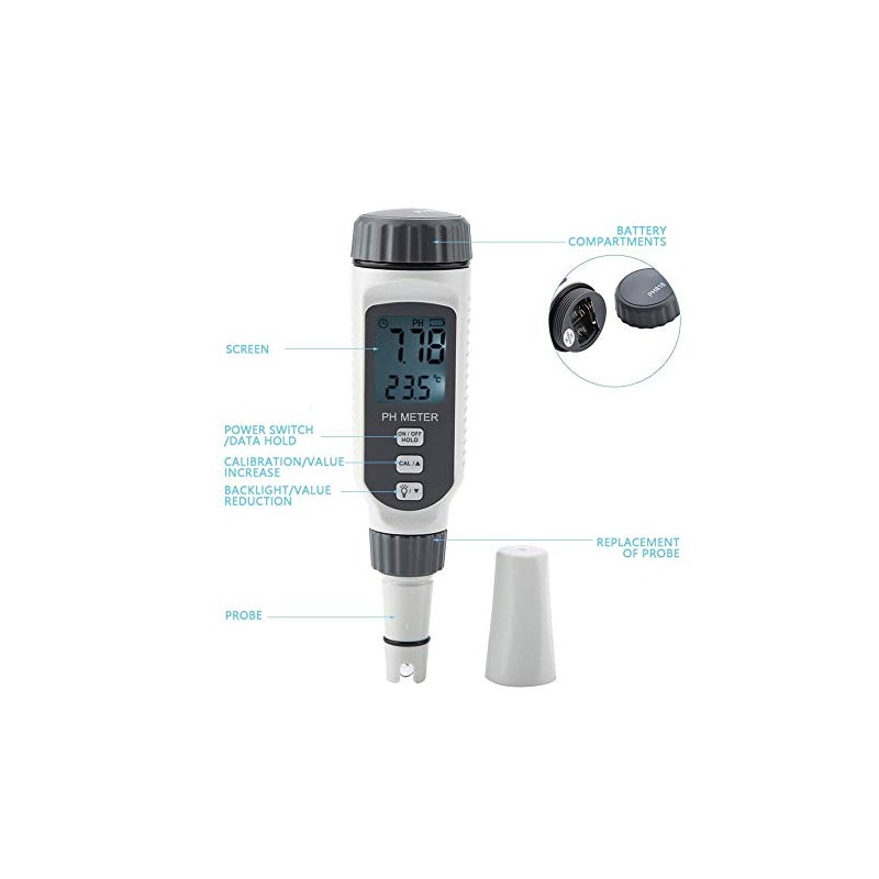 - ☛ Compact Size - Small size for easy storage and transportation. It is very accurate for the measuring range of 0.00 - 14.00 ph, ± 0.05 pH resolution, portable for wide use.