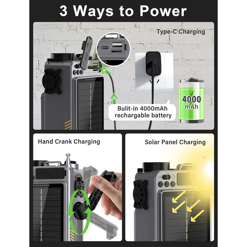 • 【 4000mAh Rechargeable Battery&3 Charging Ways】Never worry about running out of power - this portable shortwave radio built-in 4000mAh battery can use 12hours after fully charge by type-c.When the power runs out or in an emergency,put the solar radio in the sun the solar energy will automatically charge.You can rock the hand crank to charge the radio.Besides,the shortwave radio can also use as a power bank to charge your phone.It's the perfect companion for outdoor adventures, camping trips.