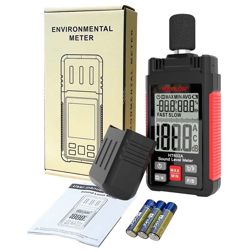 - Specifications: Acoustic level measurement range: 30 - 130 dBA; Frequency: 30 - 8 KHz; Temperature measurement range: -20.0 °C - 60.0 °C (accuracy ± 1.0 °C); Humidity range: 0.0 % - 99.9 % RH (accuracy ± 5.0 RH); Note: Batteries are in the groove of the packaging box when you receive the product, parts are missing. Make sure you are doing it