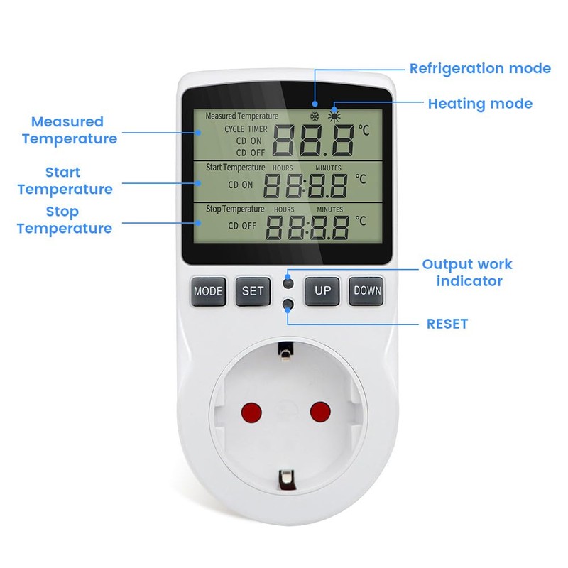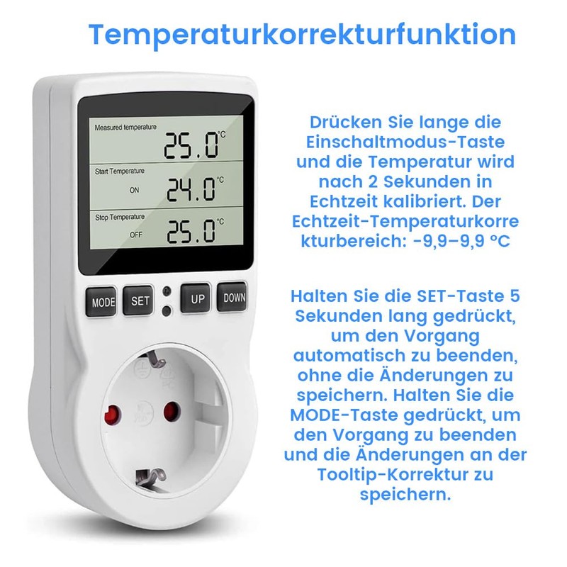 - Automatic heating/cooling switching: the intelligent thermostat socket automatically switches to heating or cooling mode as soon as the preset start and stop temperatures are reached. Ideal for a wide range of applications such as greenhouses, aquariums and terrariums.