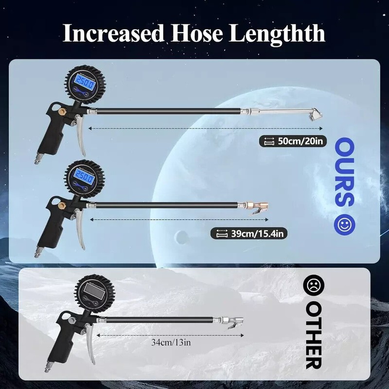 - SUITABLE FOR ALL VEHICLES: The digital air pressure gauge kit has a wide range of use scenarios - suitable for tires of cars, trucks, SUVs, RVs, motorcycles, bicycles, etc. At the same time, we have equipped parts for inflatable mattresses, swimming rings, basketballs, footballs and various inflatable equipment. Our air chuck with pressure gauge has a three-year warranty, so you can buy it with confidence.