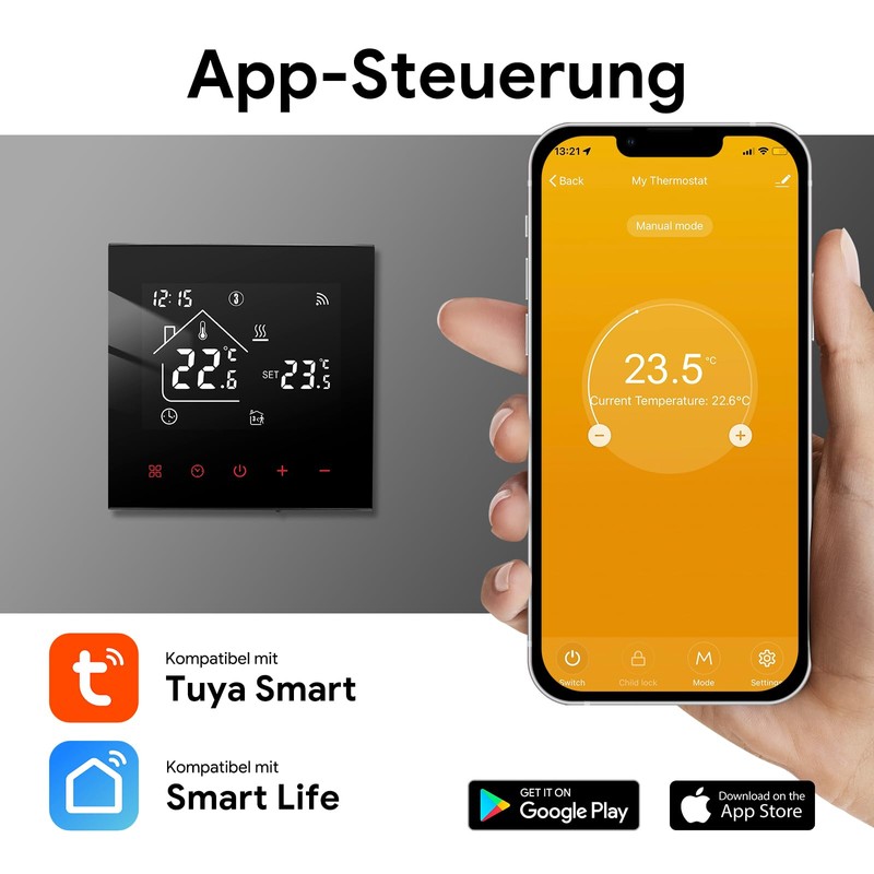 - Intelligent heating: With the room thermostat, you can control your water underfloor heating from anywhere and anytime via Tuya or Smart life app. Share devices with family via the app. Compatible with Alexa, Google Assistant, simply enter a voice command to turn your thermostat on and off.