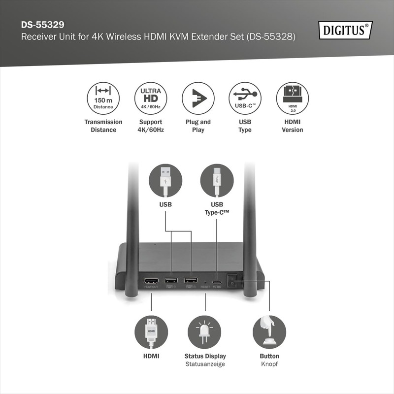 DIGITUS DS-55329 Wireless HDMI KVM Extender/HDMI Splitter (1:4) - UHD 4K/30Hz - 150m Range - Receiver Unit for DS-55328 - Loop Out, IR Infrared - HDMI 2.0 & HDCP 2.2