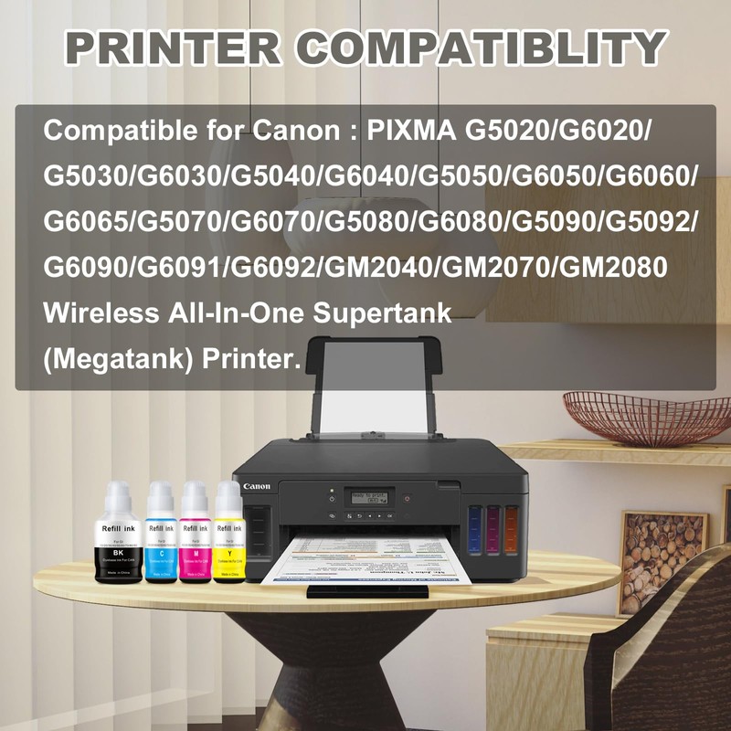 Compatible with Canon PIXMA G5020 G6020 G5030 G6030 G5040 G6040 G5050 G6050 G6060 G6065 G5070 G6070 G5080 G6080 G5090 G5092 G6090 G6091 G6092 GM2040 GM2070 GM2080 Wirelwss ALL-In-One Supertank(Megatank) Printer.