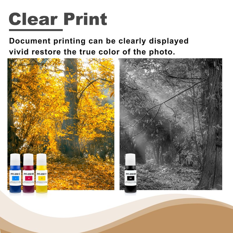 • Package includes: 4 Pack PFI-050 ink bottle (Black, Magenta, Cyan, Yellow)Capacity: 70ML each.