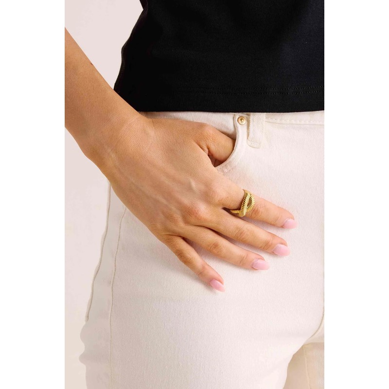 - Chunky Texture: This ring features a bold and sculptural design, with interwoven ridged bands that create a dynamic and striking visual effect. The dimensional texture is smooth yet pronounced, adding depth and movement to the piece. The gold-plated finish enhances its luxurious appeal, making it a standout accessory for any occasion.