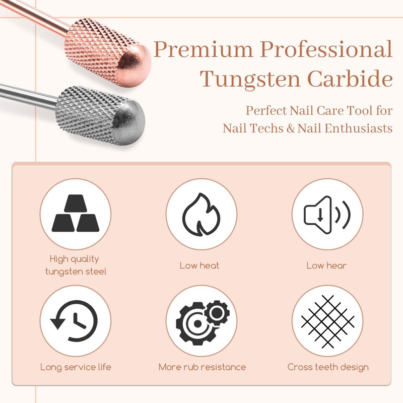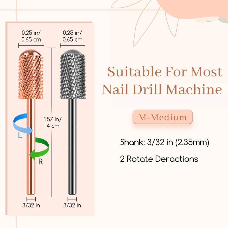 - 🌞🌞DRILL BITS FOR NAILS – You will get 2 pcs Large Barrel Smooth Top Carbide Nail Drill Bits, rose gold and space grey color. Both Coarseness are Medium. Fits universal 3/32’’(2.35mm) shank. Suitable for beginners, experienced, salon nail tech.