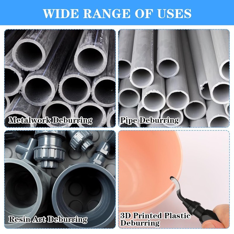• Versatile Deburring ToolOur deburring tool is ideal for cleaning up metal edges on materials such as brass, steel, aluminum, copper, and PVC pipes. It's perfect for automotive parts, gears, and other newly cut metal components. Additionally, it's highly effective for trimming the edges of 3D-printed plastic objects or parts. A must-have plumbing tool for professional plumbers, mechanics, industrial professionals, and DIY enthusiasts alike.