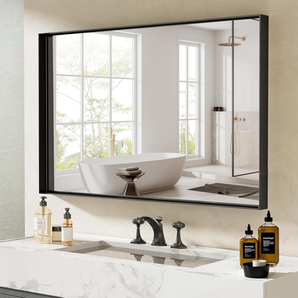 Dimelax 48”x 30” Black Bathroom Mirrors for Over Sink,Large Wall Mounted Rectangular Mirror, Metal Framed, Tempered Glass, Black Bathroom Vanity Mirror, Horizontal/Vertical