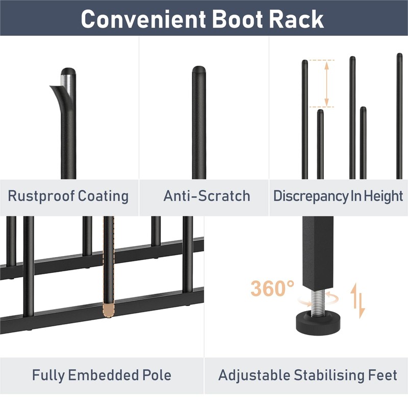 - [Durability and Adjustable Stabilising Feet]Crafted from rust-resistant metal with a black powder-coated finish, this outdoor shoe rack is built to last. The 4 adjustable feet of boot storage organizer tall boots ensure stability on uneven surfaces, while protecting your floor from scratches or damage