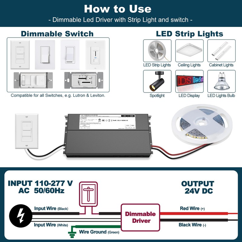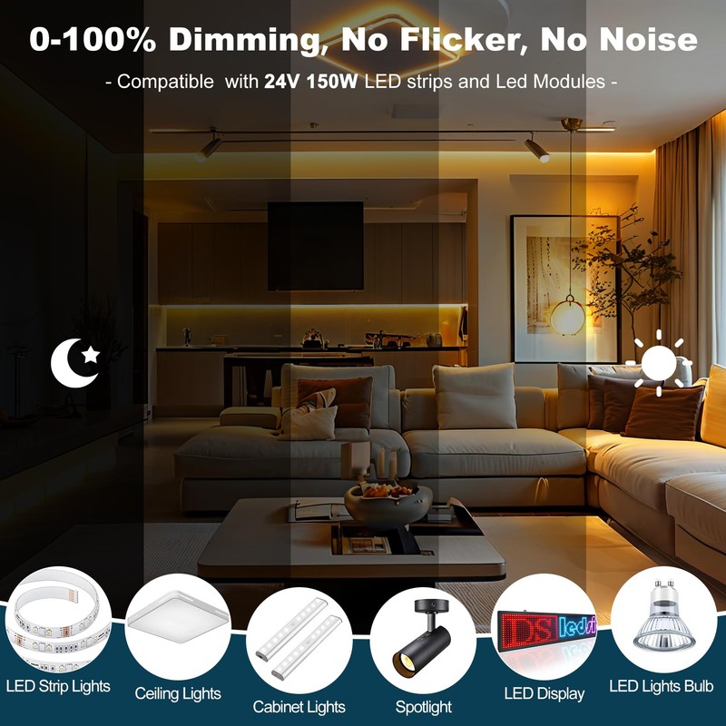 - 【Widely Use】Power supply from 110-277AC to 24V DC with 0-100% smooth and full range flicker-free dimming. This dimmable led transformer can be used for a variety of applications, including 24V LED Strip Lights,24V Power Supply,LED modules, ideal for residential and commercial Lighting use