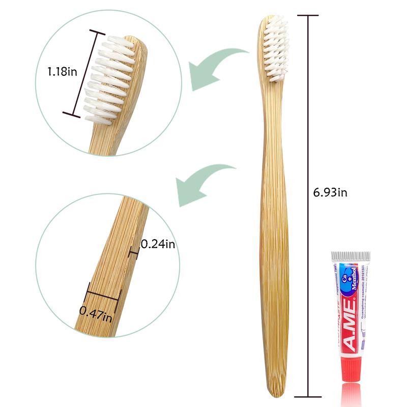 Travel size toothbrush kits includes: one bamboo toothbrush, one 6-gram mini tube of toothpaste.
