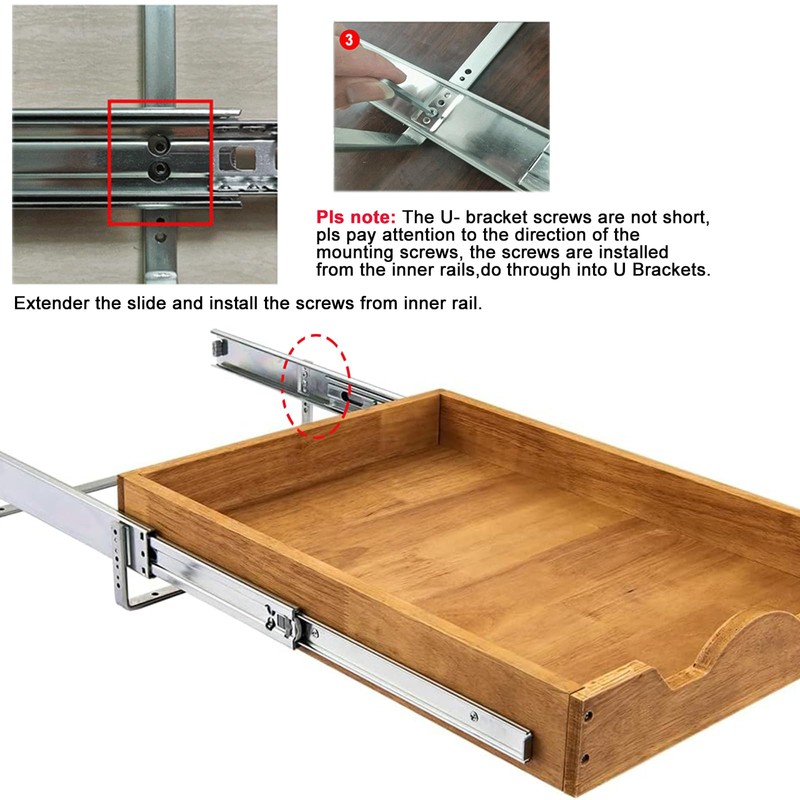 • Effortless Installation. No measurement is required at all, with our step-by-step manual, plus the mounting template that helps align with the cabinet floor. Pls note: The U- bracket screws are not short, pls pay attention to the direction of the mounting screws, the screws are installed from the inner rails. Watch the Amazon installation videos if you have any questions, they explain it all.