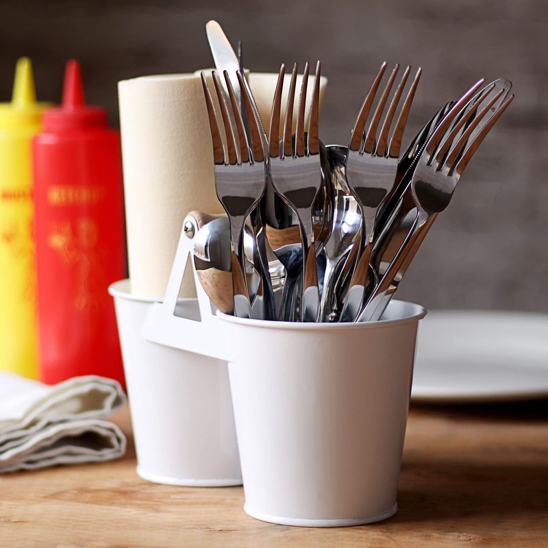 dine@drinkstuff Double Bucket Condiment Caddy - White Galvanised Steel Cutlery Table Tidy and Utensil Organiser