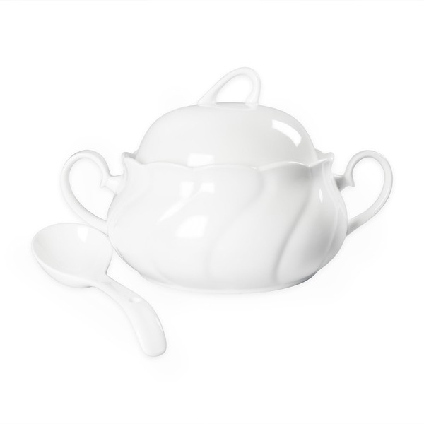 dingdaer Ceramic Serving Soup Tureen Bowls with Lid and soup spoon, 2.1 QT White French Serving Tureen, Lovely Soup Pot for Casserole dish Salad Pasta Noodles Stew, Microwave Dishwasher Safe