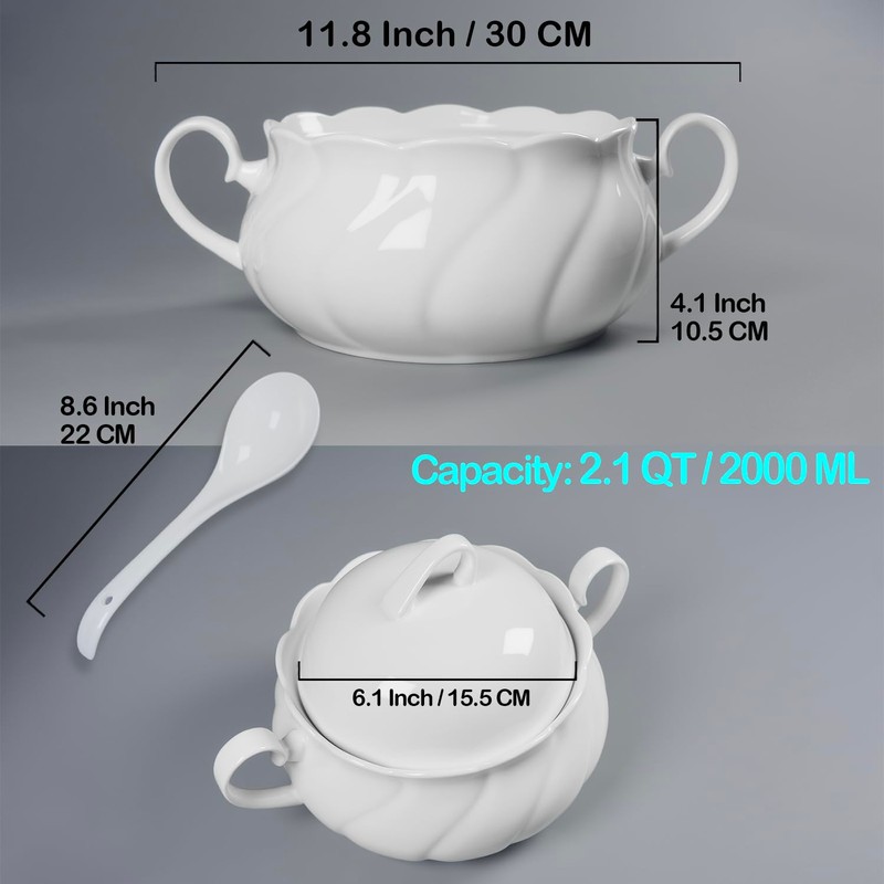 - Thoughtful and Safe Capacity Design: Soup Tureen 8.6" x 4" inch(22 CM x 10 CM), Size with handle 11.8 Inch/30 CM, Capacity: 2.1 QT/2 L, (Height including lid 7.1 inch / 18 CM), Comes with an 8.6-inch /22 cm spoon. The heat-resistant handles on both sides of the Soup Tureen make it easy for you to move safely. The Ceramic cover Easy to pick up allows you to see the status of the food inside at any time, while preventing dust from entering. The circular handle at the top makes it easy for you to hold. which to some extent keeps food fresh.