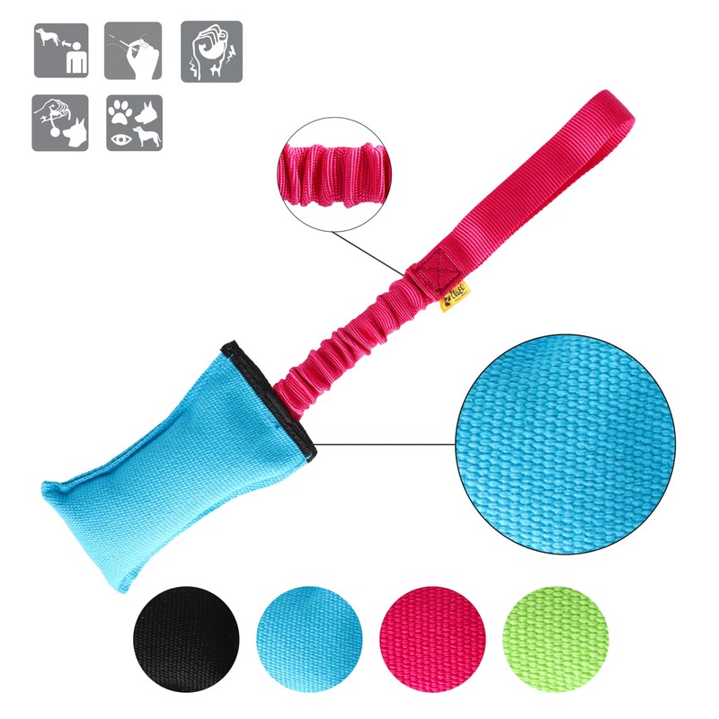 - The Agility tug toy features a bungee handle that absorbs the force when the dog pulls.The dog toy is expertly sewn to ensure durability during your training sessions