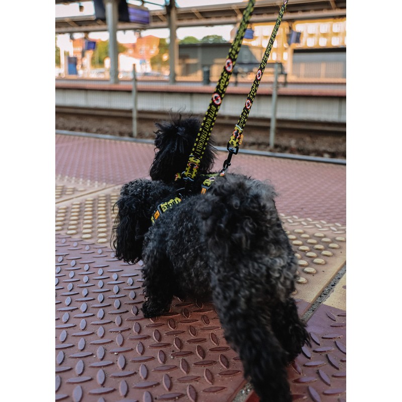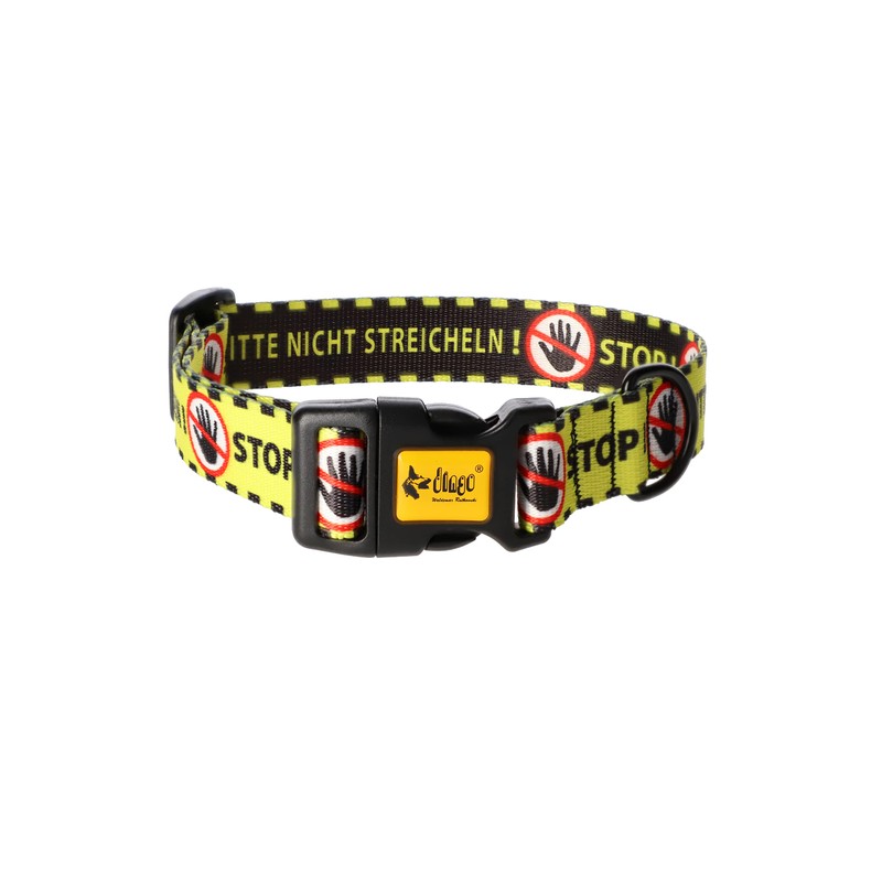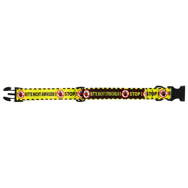 - Dingo Dog Collar Yellow Stop Please Do Not Touch Double adhesive tape stop, please do not stroke! Yellow Dog Project international campaign 2.0 x 45 cm (23-34 cm) adjustment range here the dog's neck circumference must be determined: 23 - 34 cm. Width of dog collar: 2 cm