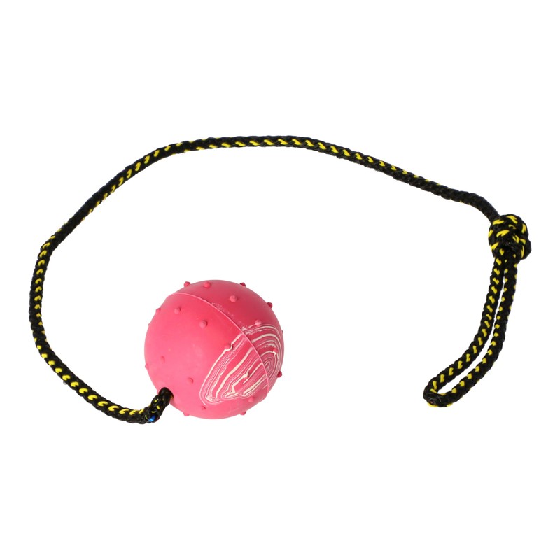 • The rubber fetch ball, in a medium size, has a diameter of 6 cm. The dog toy features a handle in the form of a cord, approximately 60 cm long. The fetch toy weighs 175 grams