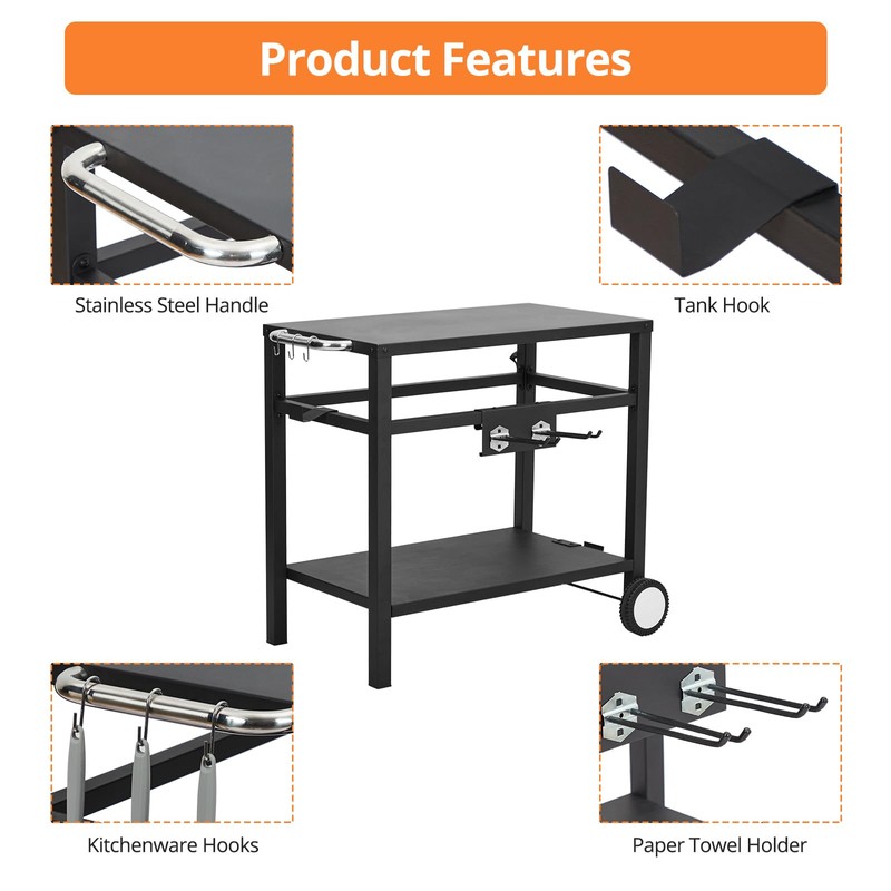 - Ample Storage Space: With a double-shelf construction design and 4 hooks, there is plenty of storage space for your tools, utensils, and ingredients. The dining cart can hold up to 220 lbs and is perfect for holding your grill, pizza oven, or other large appliances.