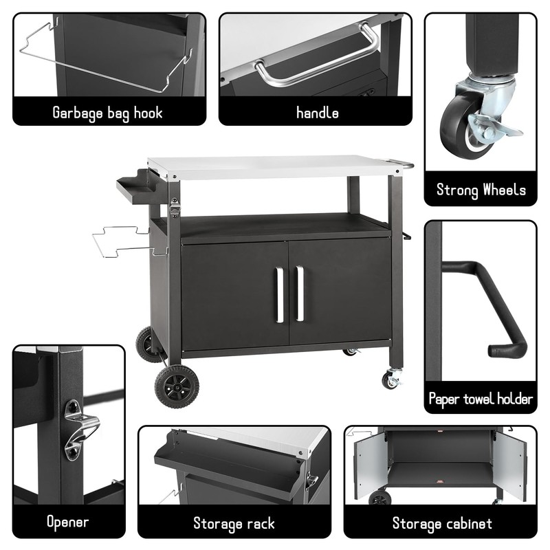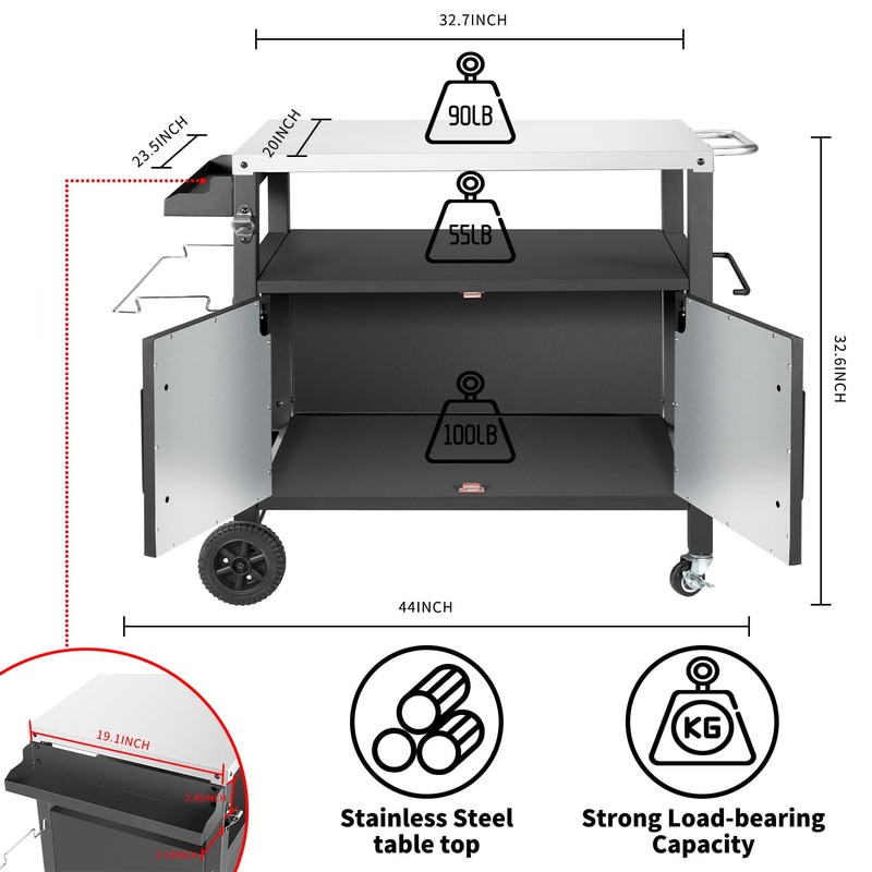 - 【Two Shelves and One Big Cabinet for Ample Storage】The grill table is designed with a practical dual shelf structure, giving you plenty of storage space for added convenience when organizing and transporting your items. The Top and bottom shelf weight capacity: 100 LBS, middle shelf weight capacity: 50 LBS.