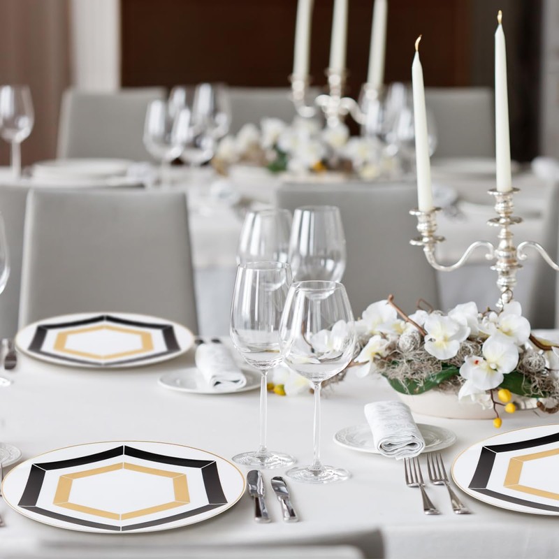 - Fancy Party Plates: Elevate your events with the stylish black, white, and gold honeycomb design.