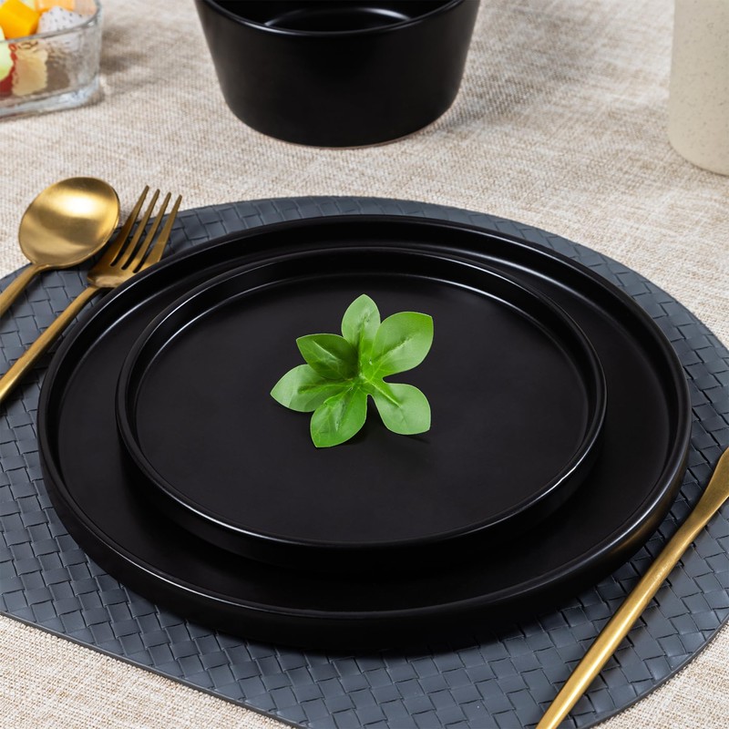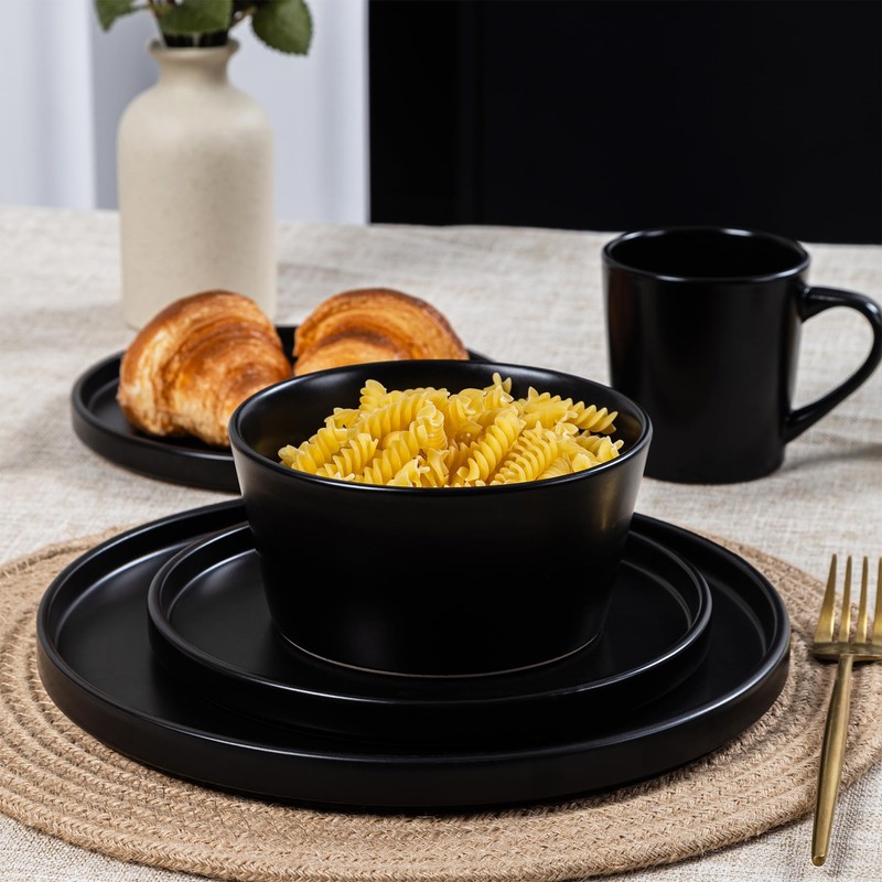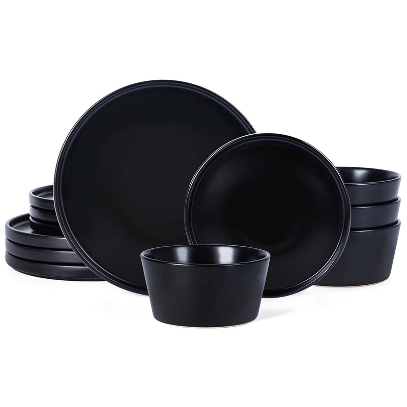 Dinnerware Sets for 4 - CJDC-QUELO 12-Piece Stoneware Plates and Bowls Sets, Ceramic Dishware Sets for Kitchen Use and Formal Dining, Chip and Scratch Resistant Microwave Dishwasher Safe, Black