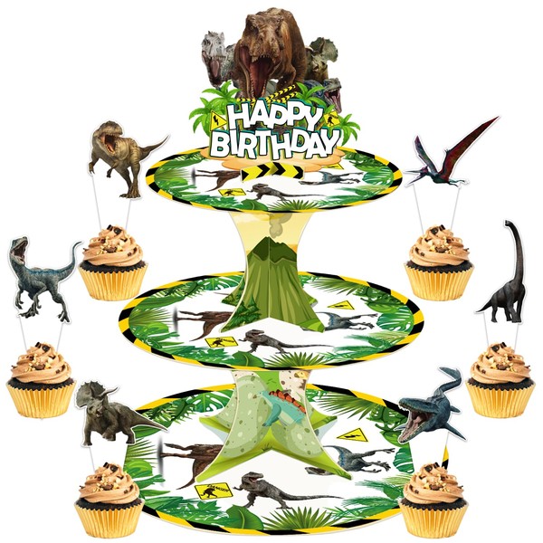 Dinosaur 3-Tier Cupcake Stand with 6 Dinosaur Cupcake Toppers - Perfect for Dinosaur-Themed Birthday Party Supplies