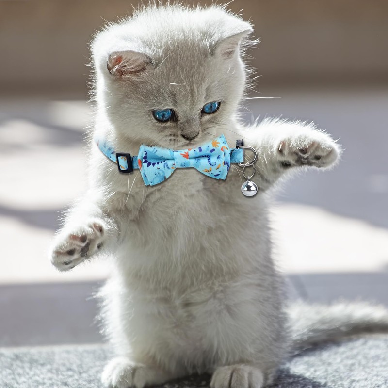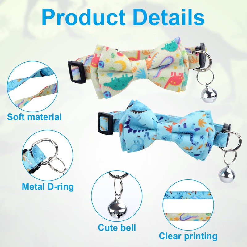 - Exquisite Design: Our cat collar is designed with dinosaur patterns, bows and bell pendants, which are cute and fashionable. The safety buckle design allows the collar to be quickly put on and take off.