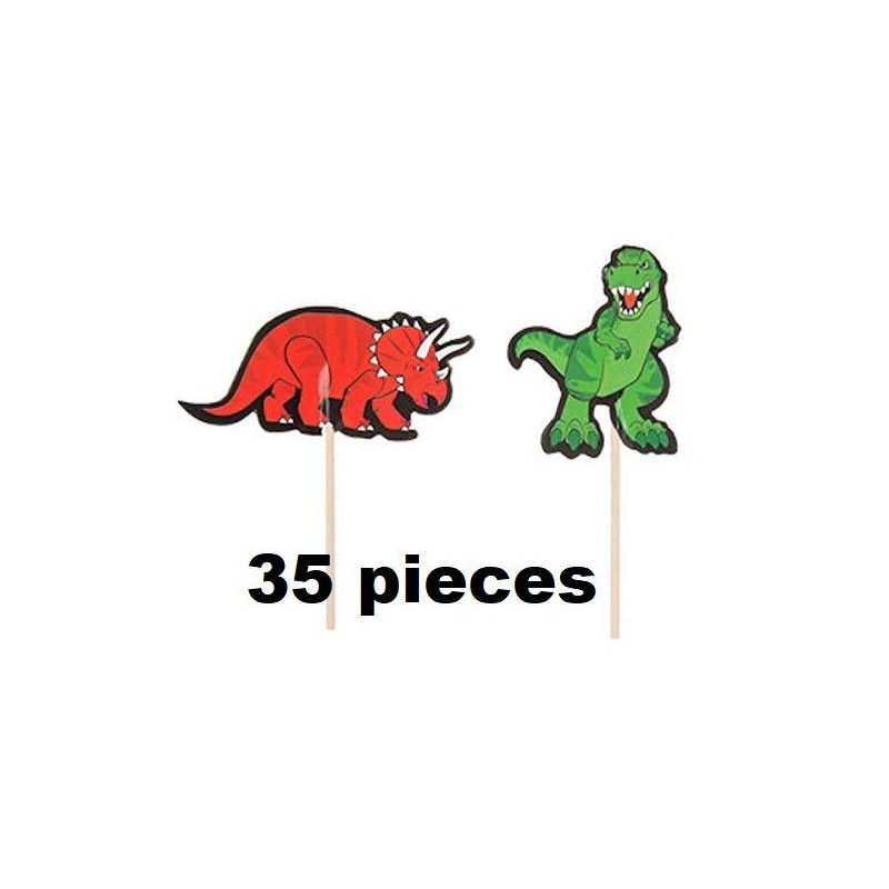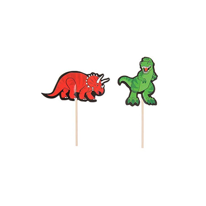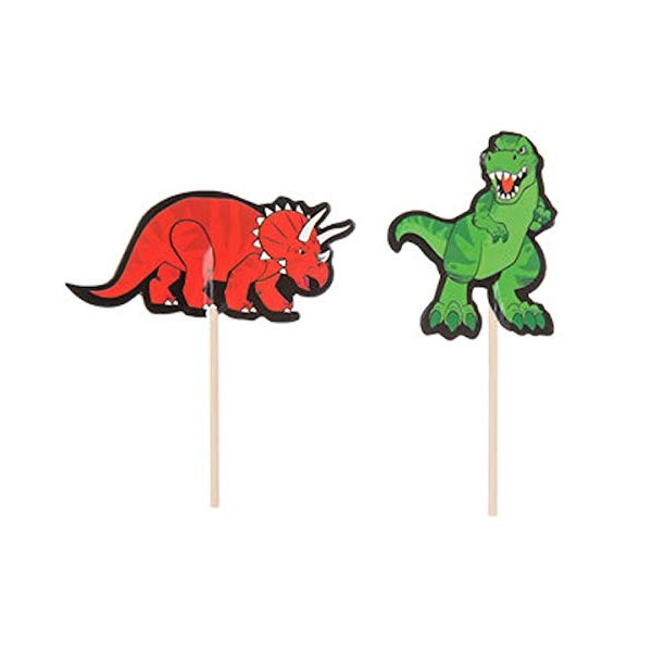 - Product Description: Roar! Devour your delicious cupcakes that are themed to match your dinosaur party! Dinosaur Cupcake Toppers feature toothpicks with two different, fun dinosaur designs attached to the top. From the T-Rex green to the red Triceratops, these dinosaurs are a fun way to add even more to your event! Simply stick the toothpicks into the tops of your cupcakes, and serve!