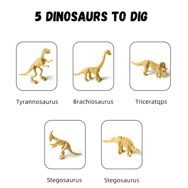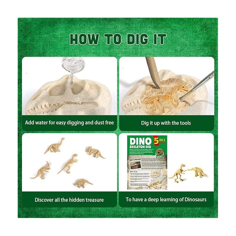 - 🦕 Dive into Prehistoric Adventures: Embark on an archaeological journey with our 5 in 1 dinosaur fossil digging kit for kids, designed for curious minds eager to explore the mysteries of ancient dinosaurs. Unearth five unique dinosaur skeletons for an immersive paleontological experience.