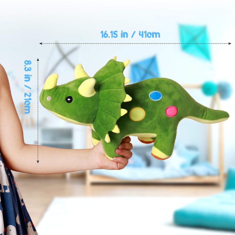 Dinosaur (Triceratops) stuff pillow fluffy lovable toys for children and adults of all ages. This guy measures a full 16" (40cm) from head to toe. Soft as cotton and ready for hugging and cuddling around. Cute Attractive Face! Will spend time and pay attention to its owner's every moment of happiness and sadness. Listen to all your story and keep them as secrets. A best pal always a hug away,
