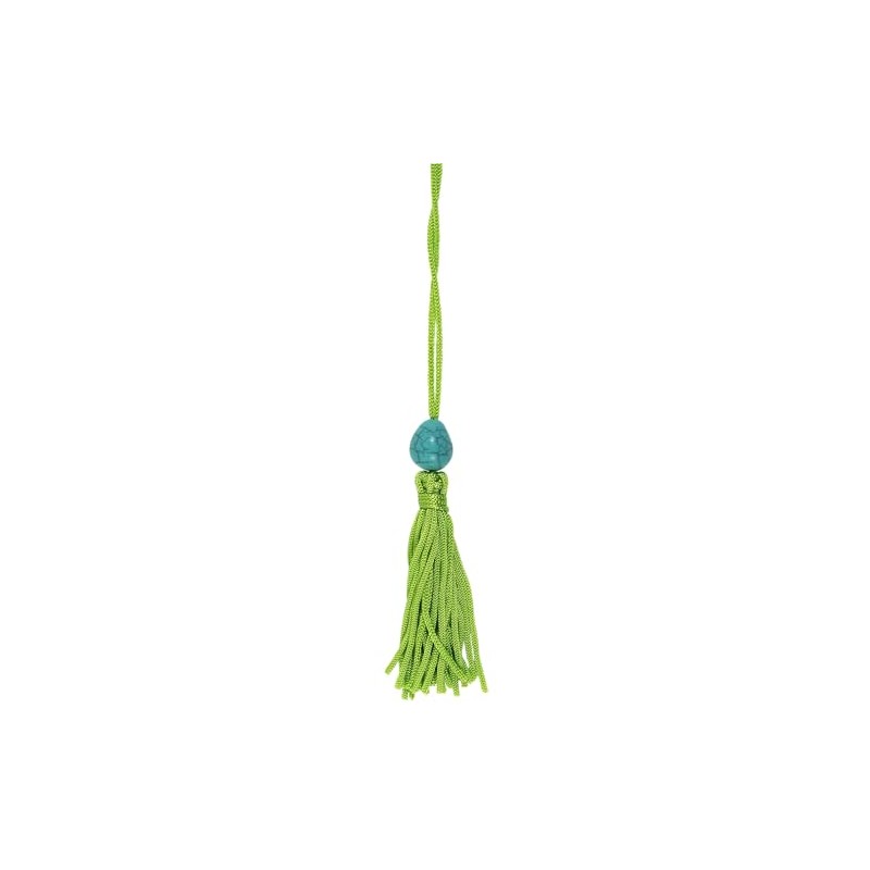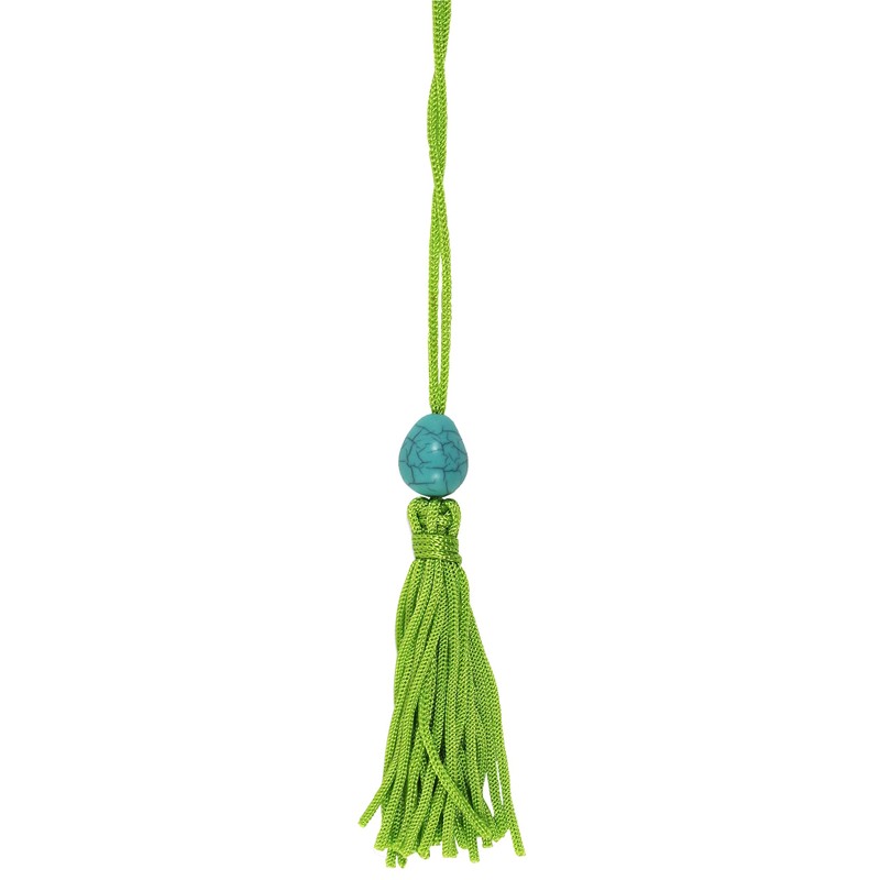 - Attached: A silky green tassel with a marbleized blue accent bead.