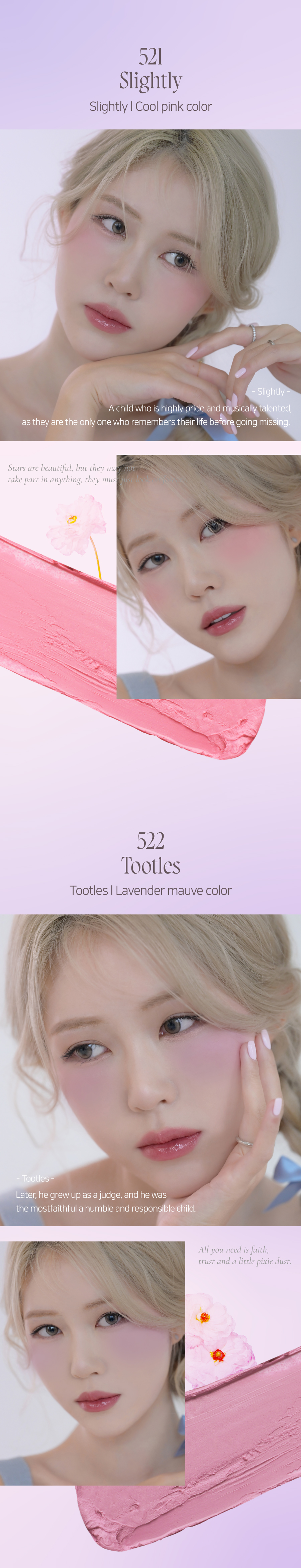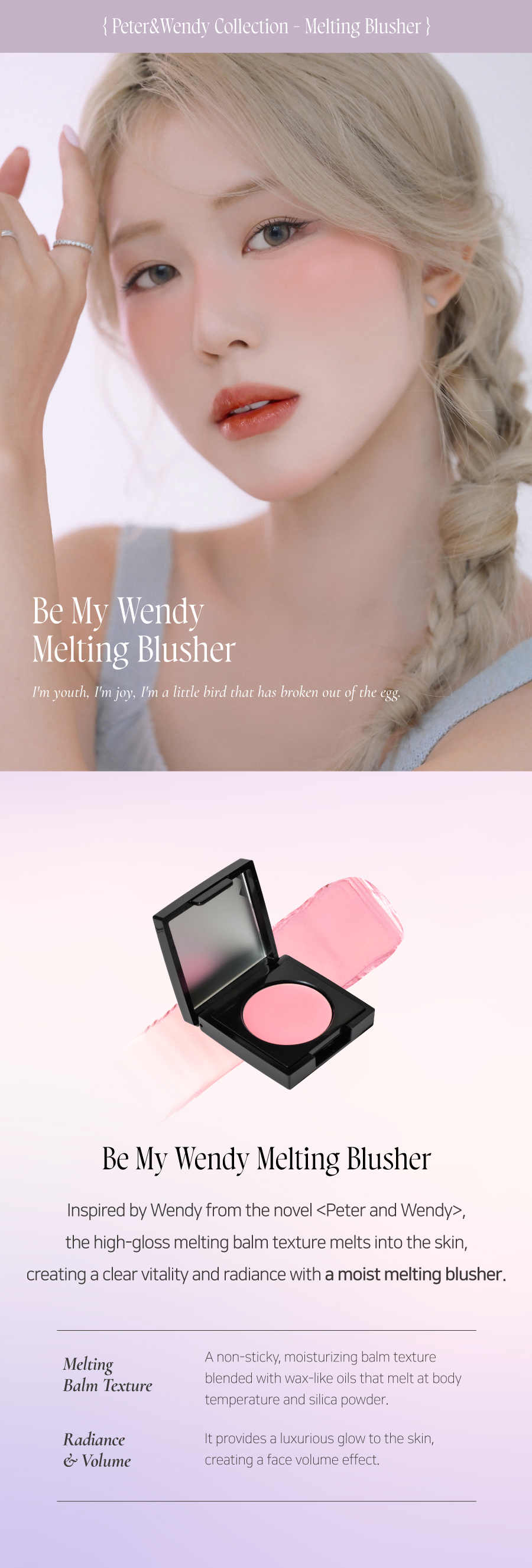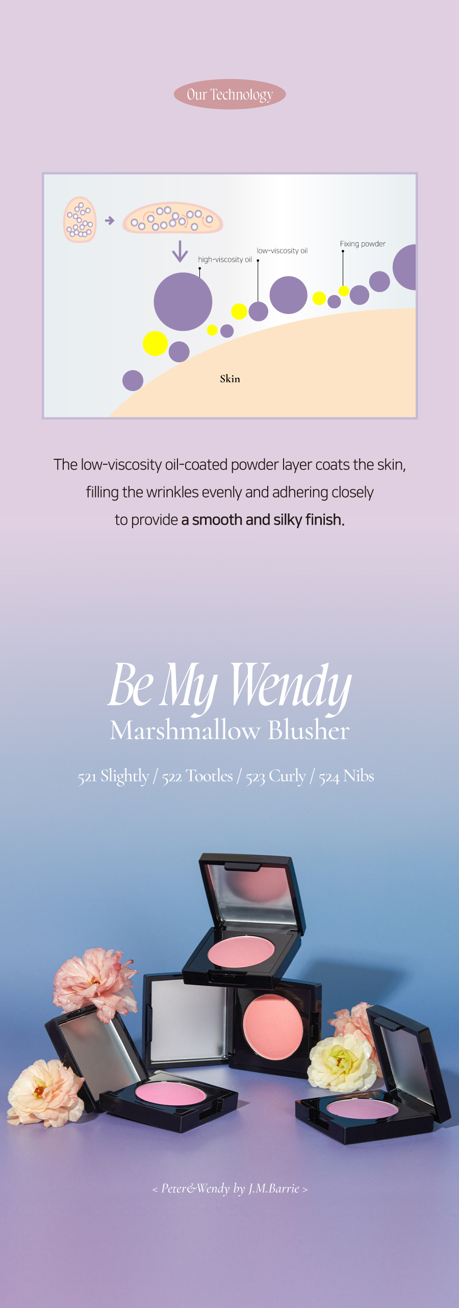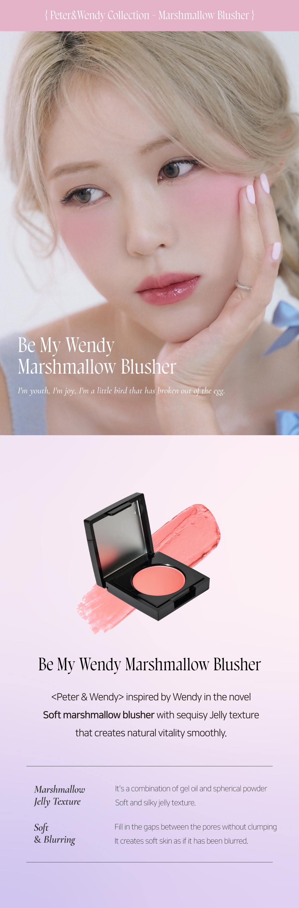 Be My Wendy Blusher collection presents 6 shades inspired by The Lost Boys in 2 different textures. The 2 textures, Marshmallow & Melting, seamlessly lay on the skin like a watercolor pigment, and ultrafine fixing powder mattifies for a long-lasting sheer build of color. Regardless of your choice of tool, this blusher easily blends without messing the base makeup, thanks to its soft flexible texture.
