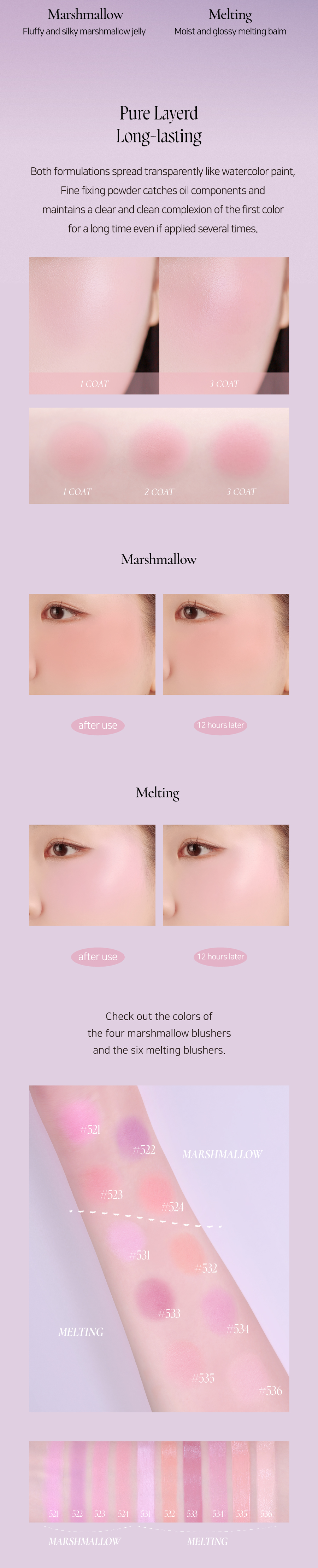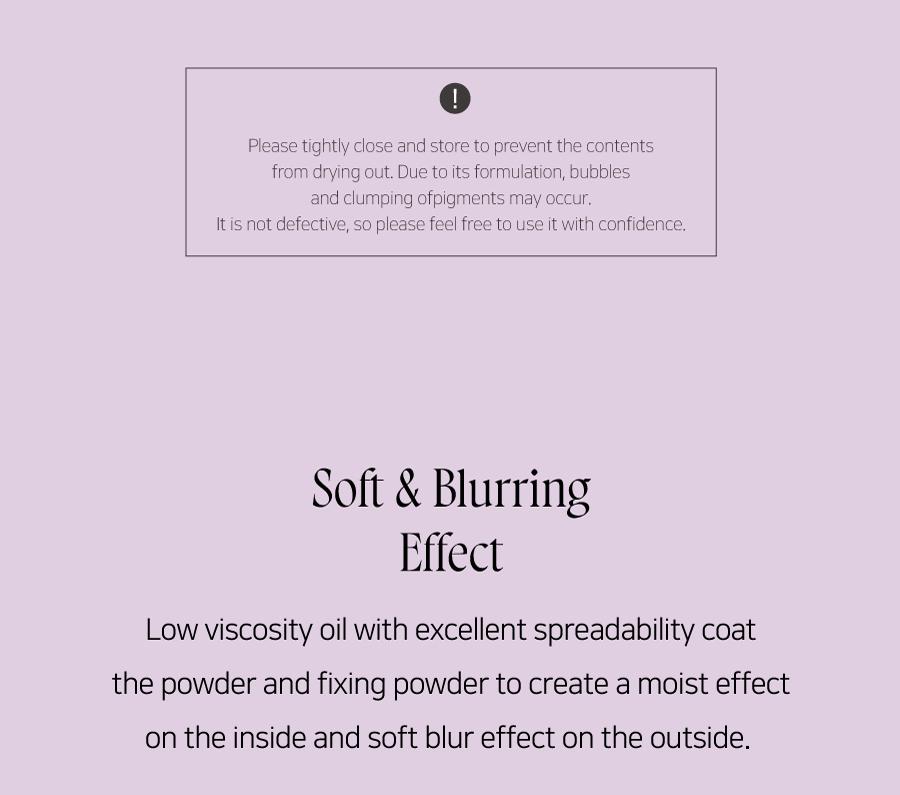 Its Marshmallow formula layers seamlessly and blurs skin texture for a soft-matte finish. Fixing powder infused with super-spreadable oil offers a non-drying, soft-blur effect. Powder layer coated with low-density oil blurs texture imperfections towards a smooth, matte finish. Its Melting formula is made with waxy oil and light silica powder, naturally to give a non-sticky, moisture-rich finish. A blend of light oil and high-shine oil offers a luxurious glow and plumping effect.