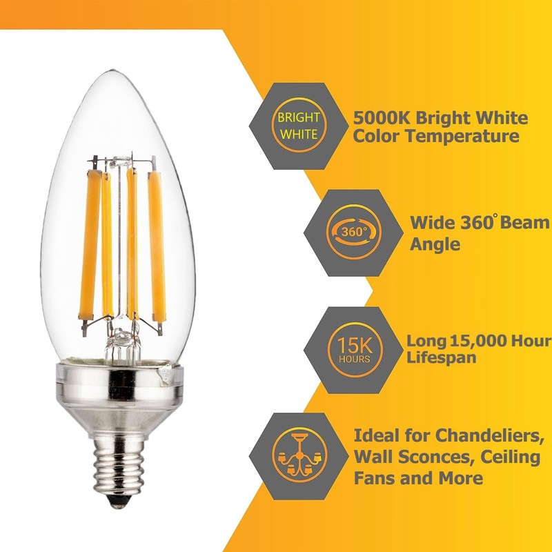 Diodesy- LED Candelabra Light Bulbs B11 Chandelier 8.8W (75W Equivalent) E12 Base Candle Dimmable Bulbs 800LM 5000K Bright White Filament Clear Glass for Ceiling Fan Pendant Wall Sconce Pack of 6