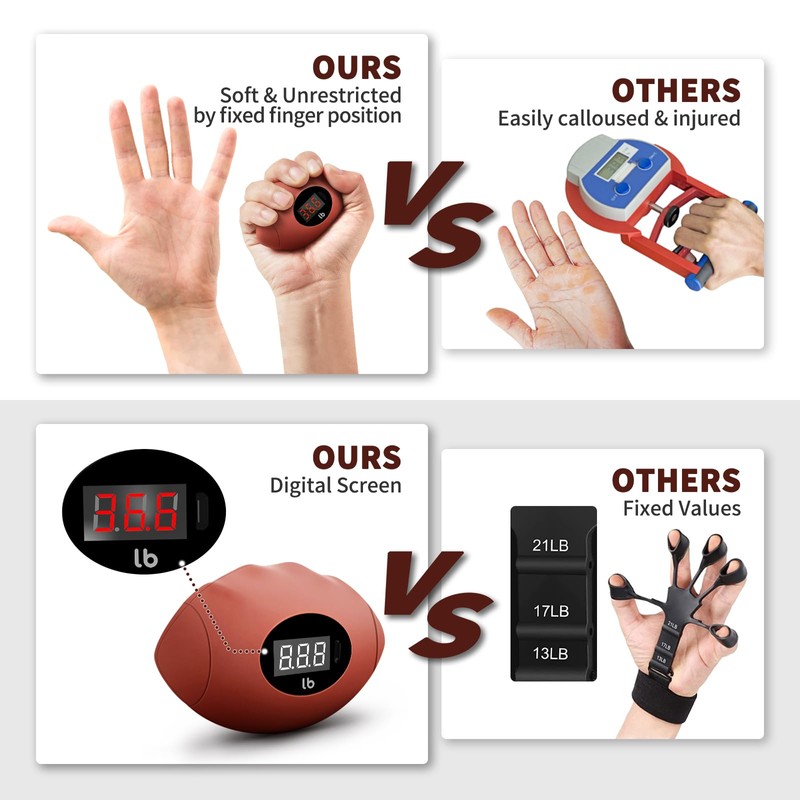 - Portable & Ergonomic DesignThe dynamometer grip strength trainer contoured football shape and silicone material, provides a comfortable grip, and prevents calluses and sprains. This portable grip strengthener is perfect for on-the-go strength training, fitting seamlessly into your bag or pocket. The hand grip strengthener grooved fingerprint path design ensures comfort during use, reducing strain and fatigue.