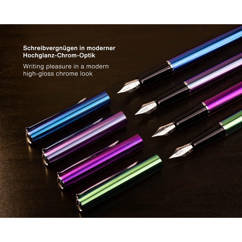 - Timeless fountain pen holder: slim design with high-quality anodised all-metal housing that changes colour depending on the exposure to light and gives each fountain pen a unique look.