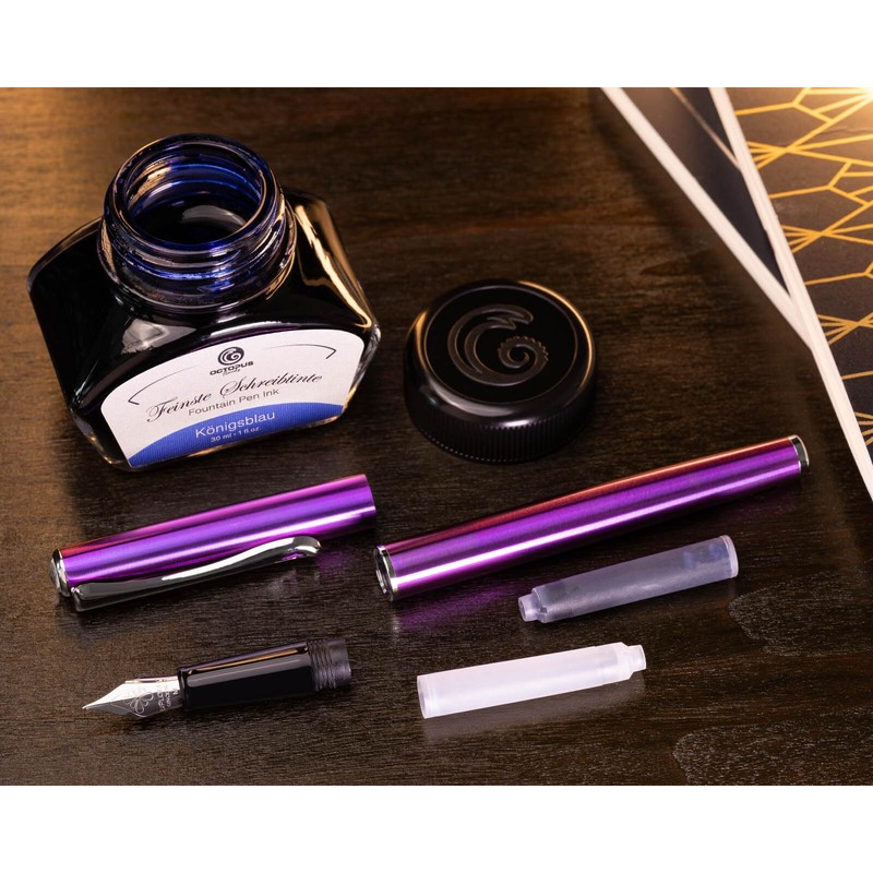 - ELEGANT WRITING SET: Includes the slim Diplomat Traveller Funky fountain pen ink in royal blue (30 ml) from Octopus Fluids, a genuine leather pen case and an ink converter.